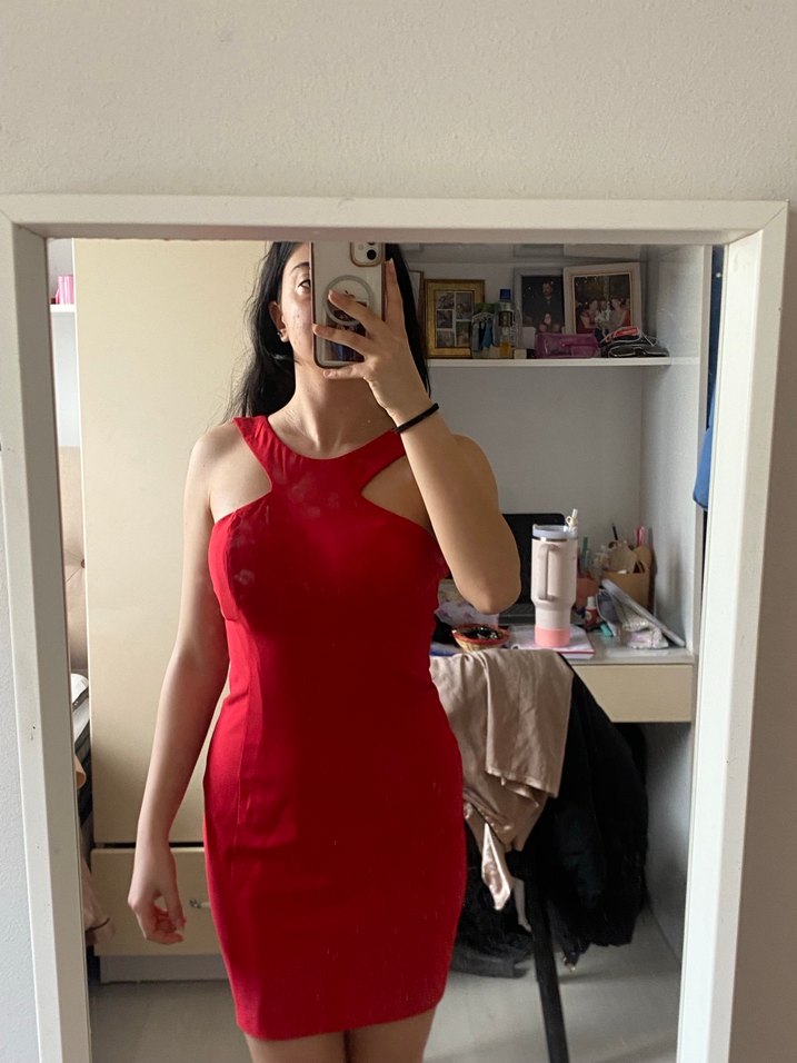 Kırmızı, parlak ve v yaka kesime sahip, kolsuz, yırtmaçlı midi elbise, çağdaş ve minimalist tarzda romantik akşamlar için uygun. ✨