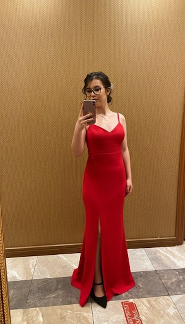 Kırmızı parlak kumaştan, V yakalı ve ince askılı, önü yırtmaçlı, vücuda oturan uzun abiye elbisedir. Romantik akşamlar için uygundur.