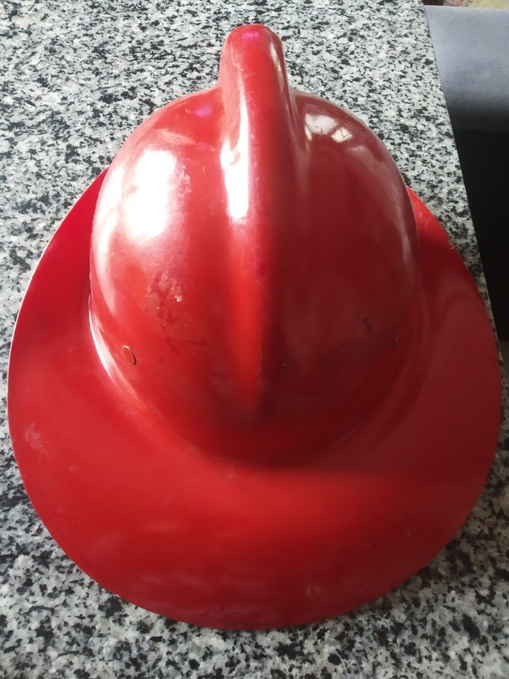Parlak kırmızı renkte, tokalı kayışlı, desen içermeyen vintage itfaiyeci kaskı.kolleksiyonluk