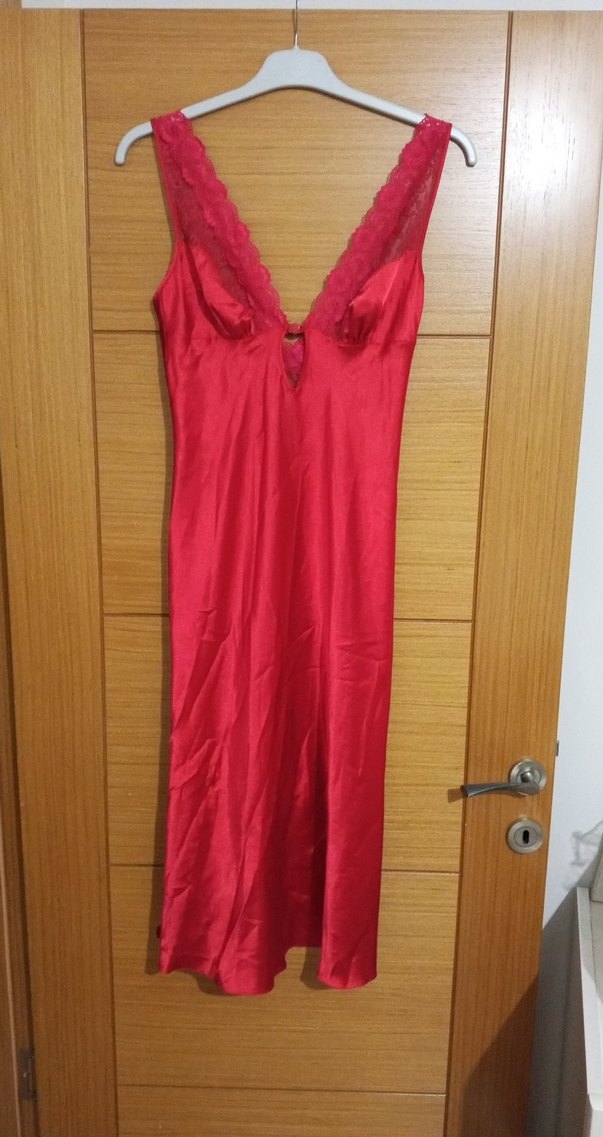Parlak kırmızı kumaştan, vintage bohem tarzında, uzun ve kolsuz, dantel detaylı derin yakalı dar kesim gecelik.