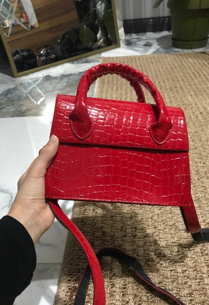 Kırmızı parlak deri çanta, yılan desenli dokusu ve tokalı detaylarıyla trendy ve günlük kullanıma uygun.