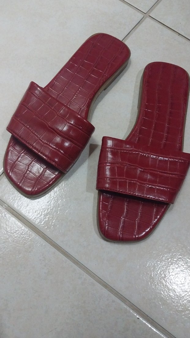 Kırmızı parlak yılan desenli, kadın terlik. Minimalist ve çağdaş tasarıma sahip, günlük kullanım için uygun...