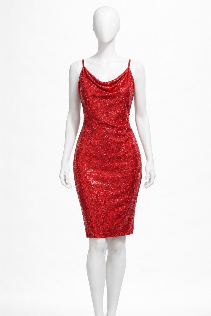 Kırmızı parlak yılan desenli, drapeli V yaka ve ince askılı, vücuda oturan midi elbise, gösterişli parti tarzı için uygundur. ✨