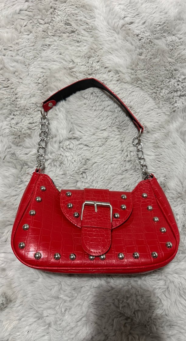 Parlak kırmızı yılan desenli deri çanta, tokalı kapak ve metal çıtçıt detaylı. Zincir askılı, rock punk tarzına uygun. Günlük kullanım için ideal.