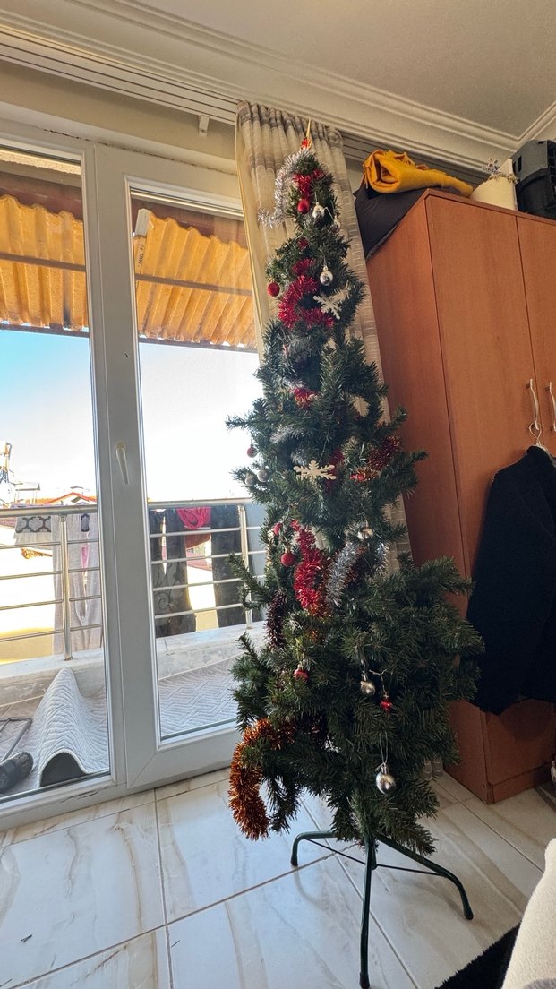 Bu uzun yılbaşı ağacı, parlak kırmızı süslemeler ve gümüş toplarla dekore edilmiştir. Metal sağlam ayak üzerinde yeşil dallara sahiptir.