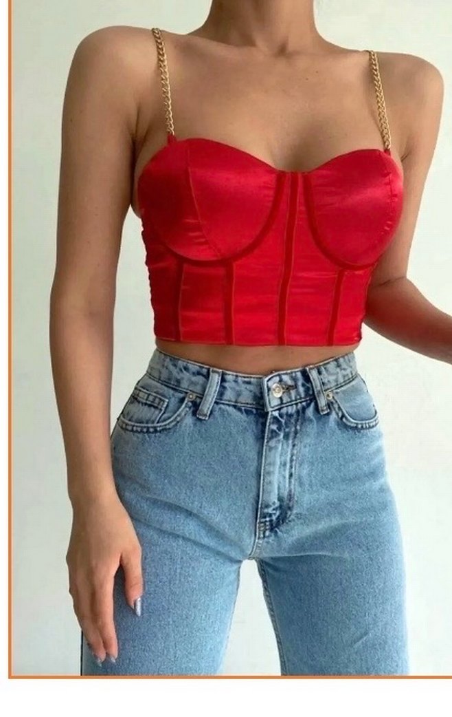 Parlak kırmızı, zincir askılı, kemerli mini büstiyer. Sıkı oturan kesimi ve sade tasarımıyla günlük sokak stiline uygun.
