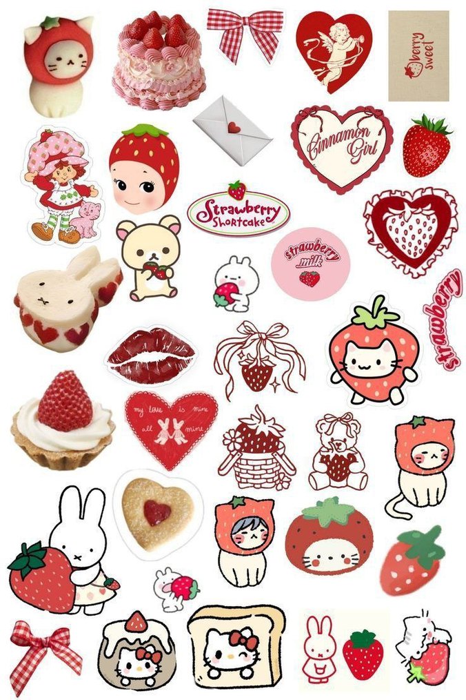 Çilek, kalp, sevimli karakterler ve tatlı motifler içeren kırmızı pastel tırnak süsleri seti. Eğlenceli tırnak tasarımları için uygundur.