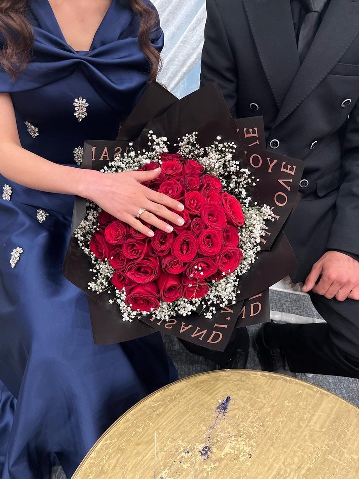 Koyu kırmızı renkli, çiçek desenli payet detaylı, uzun ve vücuda oturan bu nişan elbisesi modern klasik tarzda, kesik yakalı ve askılıdır.