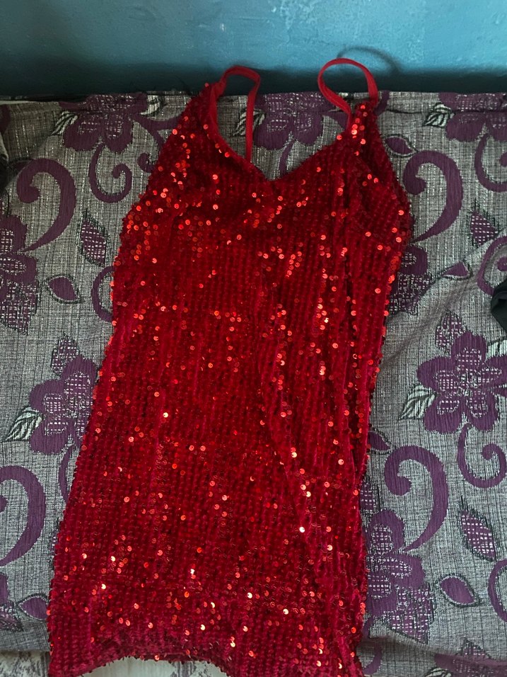 Kırmızı, v yaka, payetlerle kaplı ve nakış detaylı, uzun ve vücuda oturan kolsuz abiye elbise. Parti için cesur bir seçim. ✨