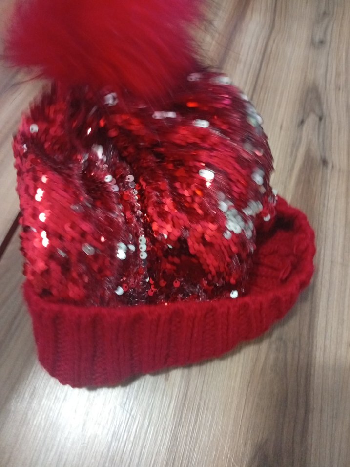 Kırmızı renkli, payet detaylı ve kürklü ponponlu kadın bere. Sıcacık ve bohem tarzı yansıtan rahat bir aksesuar.