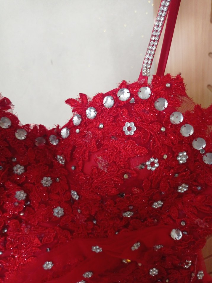 Canlı kırmızı renkte, payetli ve desenli, askılı, uzun ve vücuda oturan şık abiye elbise. ✨