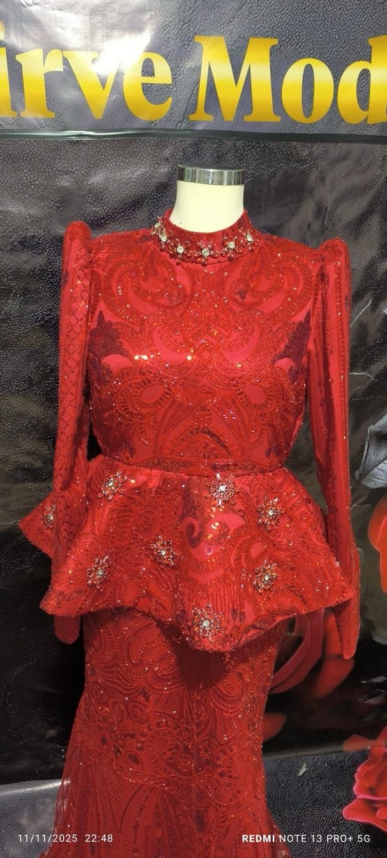 Kırmızı renkte, yüksek yakalı, uzun kollu, payetli ve desenli abiye elbise. Bel kısmında volan detayı bulunan klasik kesim, düğünler için uygundur. ✨
