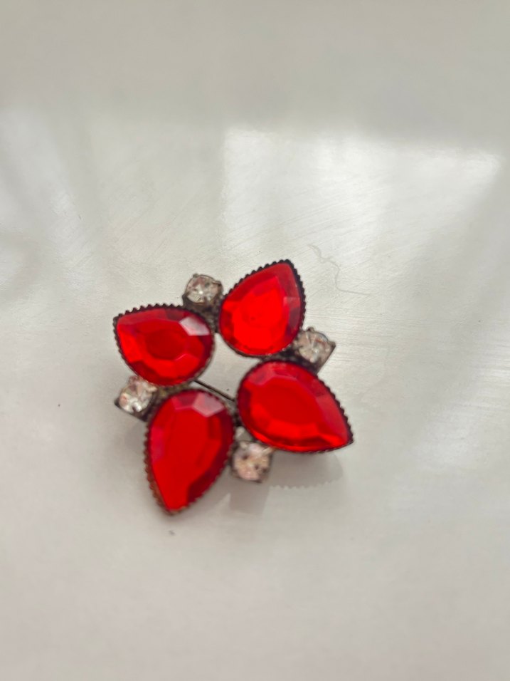 Kırmızı payetli çiçek desenli vintage broş, küçük taşlarla süslenmiştir.