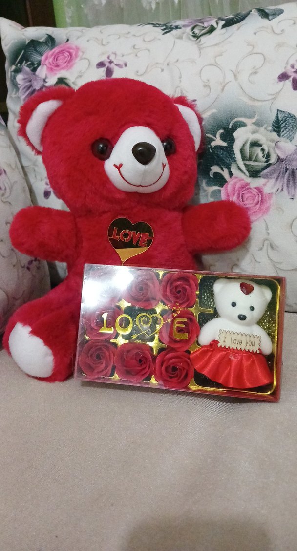 Kırmızı peluş ayı, göğsünde 'LOVE' yazılı kalp detayıyla birlikte, küçük beyaz ayıcık ve güllerle süslü hediye kutusuyla sunulur. ❤️