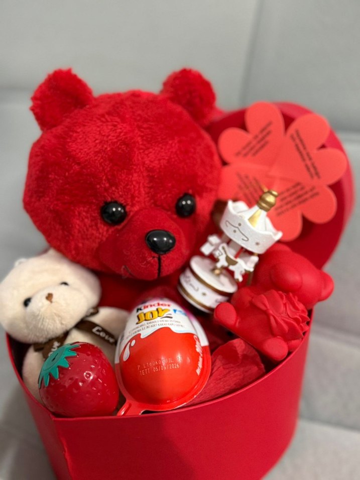 Kırmızı renkli peluş ayıcık ve çeşitli küçük oyuncakların yer aldığı kalp şeklinde kutu. Sevdiklerinizin içini ısıtacak aşk dolu bir set❤️