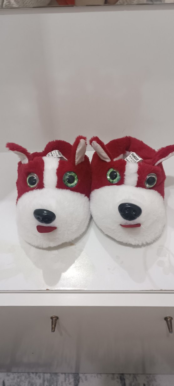 kırmızı peluş hayvan figürlü, nakış detaylı ve kürklü terlik, renkli pop kültür tarzında.