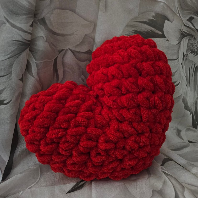 Yumuşak kırmızı peluş kalp şeklinde yastık, dokulu yüzeye sahip, dekoratif eşya veya hediye olarak kullanılabilir. İstediğiniz renklerde örülür.