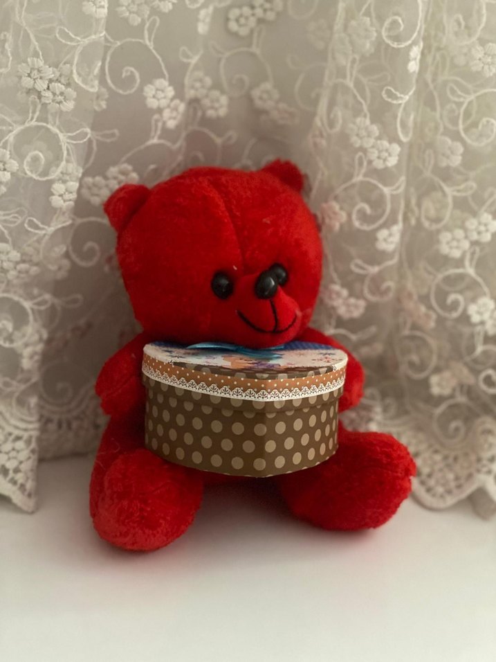 Yumuşak dokulu, renkli kırmızı peluş ayıcık, üzerinde desenli yuvarlak kutu tutuyor.