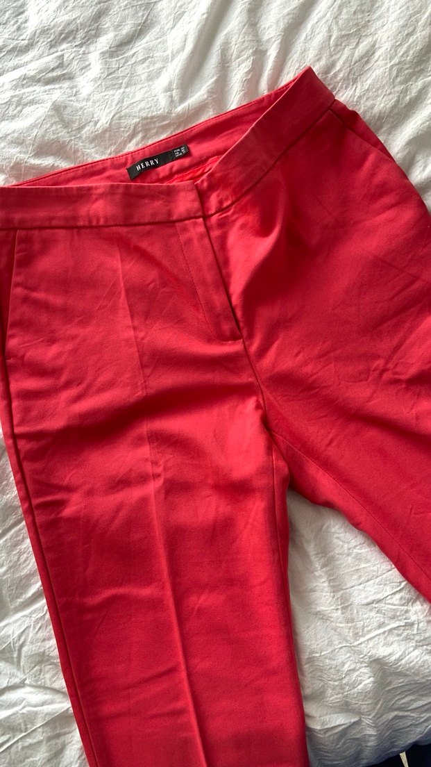 Kırmızı pembe , düğme detaylı, normal boy midi kesim kumaş pantolon. Ofis ve günlük sokak stili için uygundur.