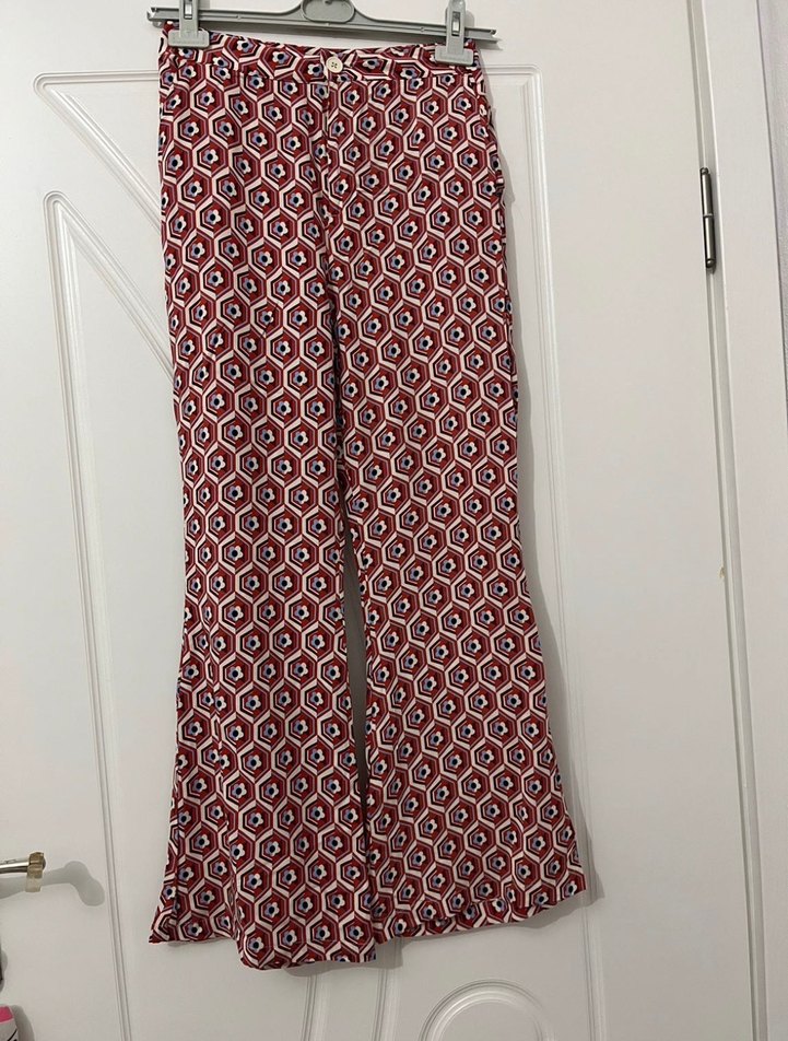 Koyu kırmızı geometrik desenli, pileli ve sentetik kumaştan yapılmış, bohem tarzda kadın ispanyol paça pantolon.