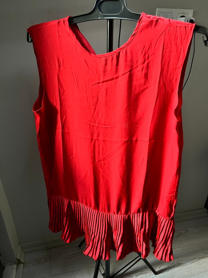 Kırmızı kolsuz bluz, yuvarlak yaka ve pile detaylı etek ucu ile. Yumuşak keten kumaştan, bol kesim ve midi boyda, günlük sokak stili için uygun.