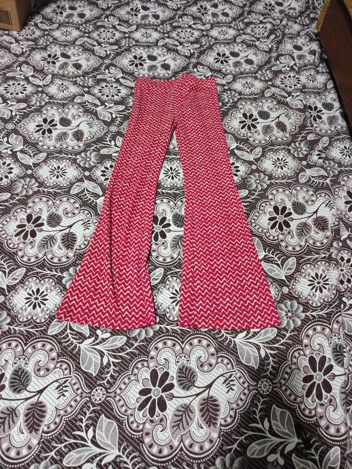 Renkli kırmızı tie-dye desenli, pilili ve uzun paçalı kadın kumaş pantolon. Yumuşak tekstil kumaştan, bohem ve rahat tarzda