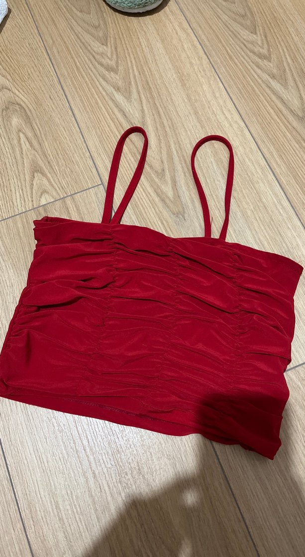 Sentetik kumaştan yapılmış, pilili detaylı ve ince askılı kırmızı crop top. Straplez yaka ve midi boyda, sokak stili için uygun.