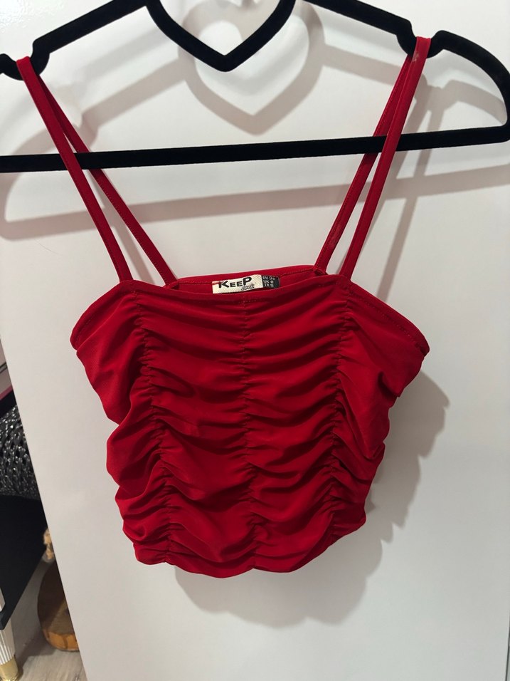 Kırmızı, pilili detaylı ve ince askılı, V yakalı, sentetik kumaştan yapılmış kısa boy fit bir büstiyerdir. ❤️ m bedendir S,m,L bedene uyumludur