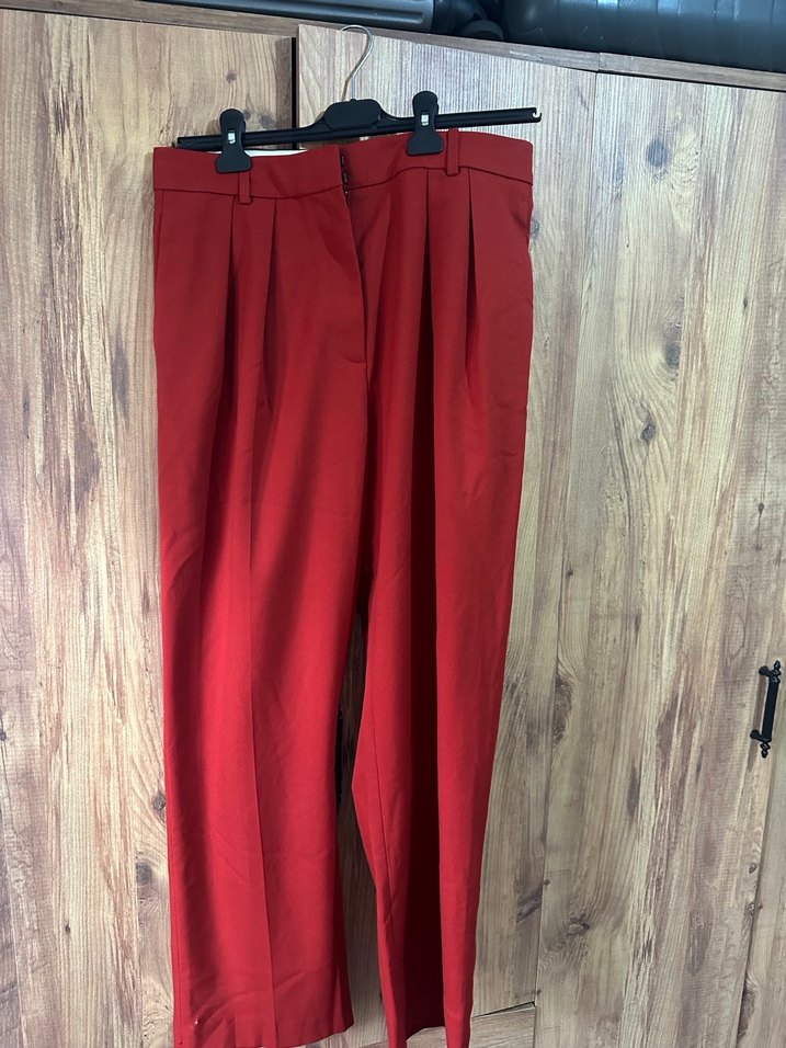Kırmızı, pilili, normal boy midi kadın kumaş pantolon. İpeksi dokulu, iş ortamına uygun, desen içermeyen klasik tarzda.