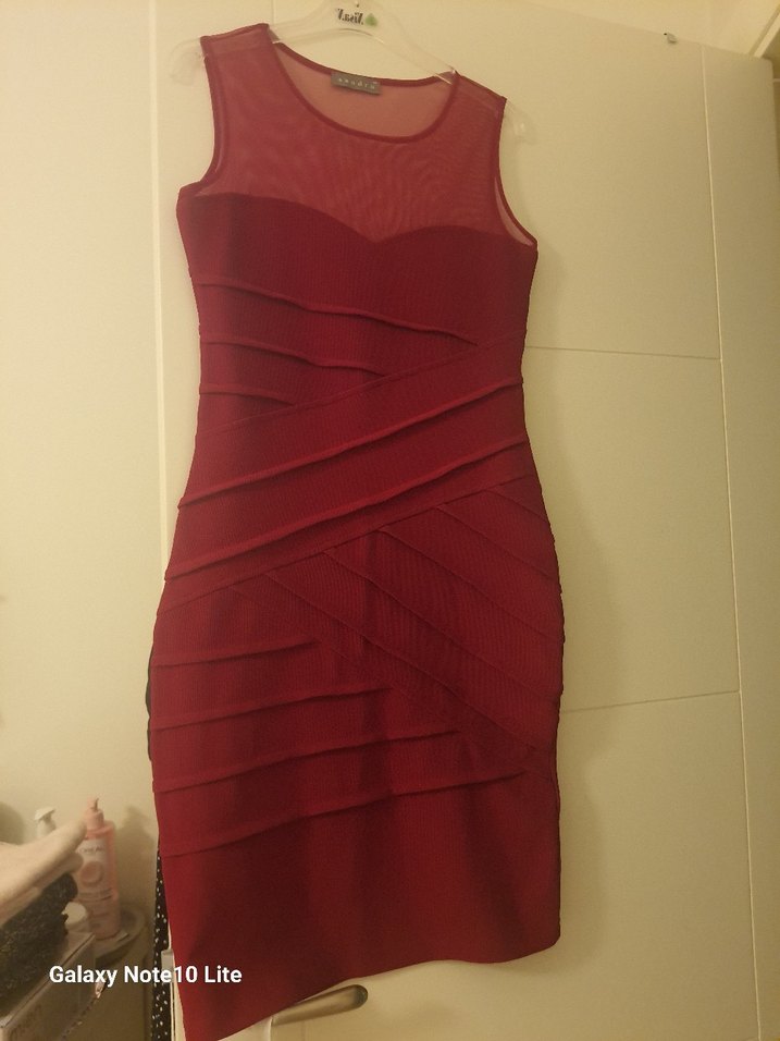Kırmızı, pilili detaylara sahip, straplez yaka ve fitted kesim midi abiye elbise. Çağdaş ve avangard tarzda, parti için uygun.