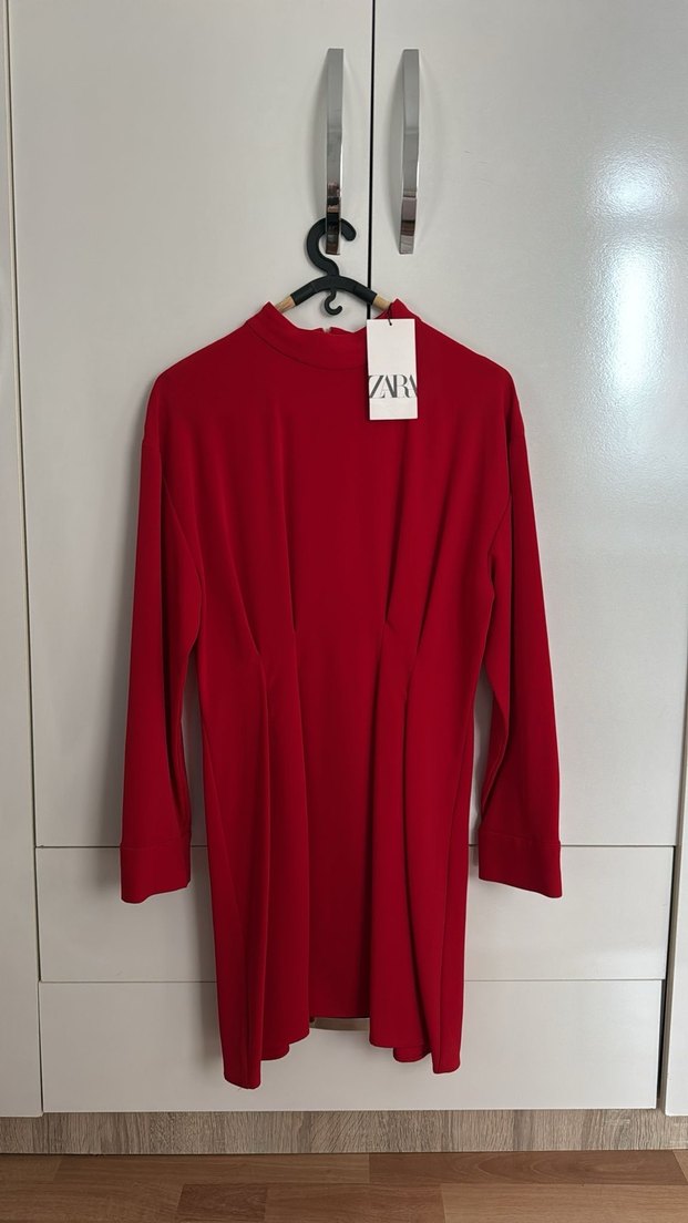 Kırmızı, uzun kollu, yüksek yakalı ve pilili detaylara sahip, vücuda oturan midi elbise. Yumuşak ve sıcak kumaştan üretilmiştir, ofis ve sokak tarzı için uygundur.