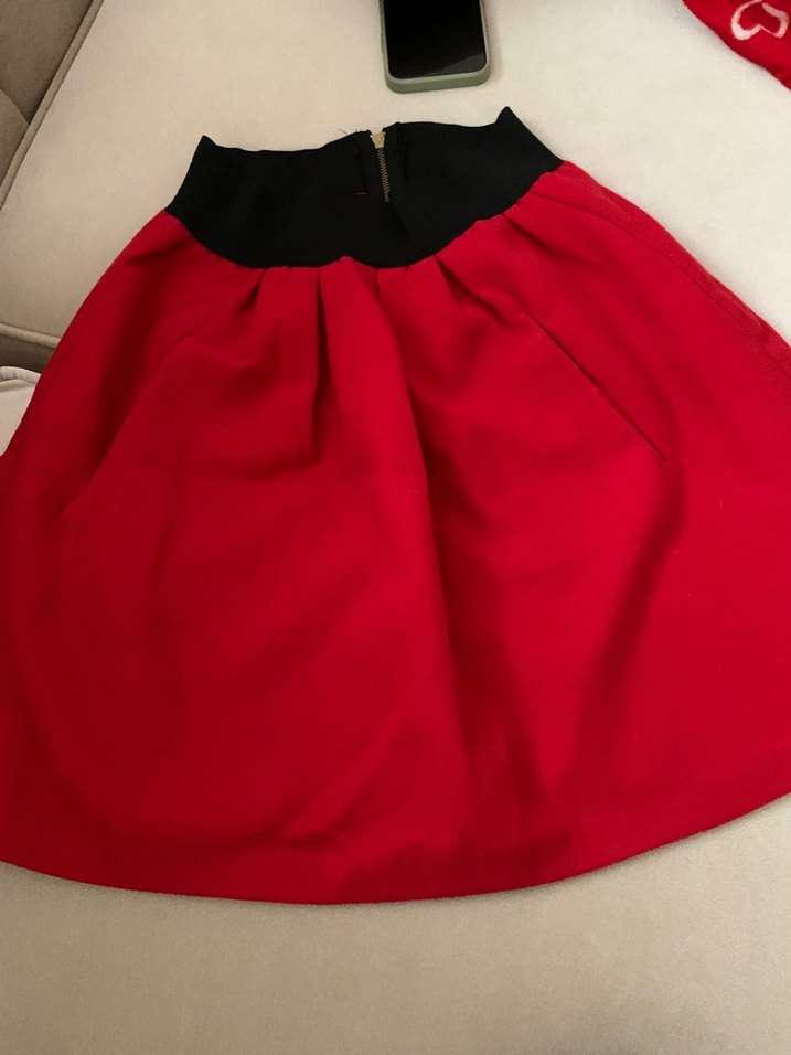 Siyah bel bandı ve canlı kırmızı renkte, pilili, bol kesim hamile eteği. Yumuşak ve sıcak kumaştan, günlük kullanıma uygun.