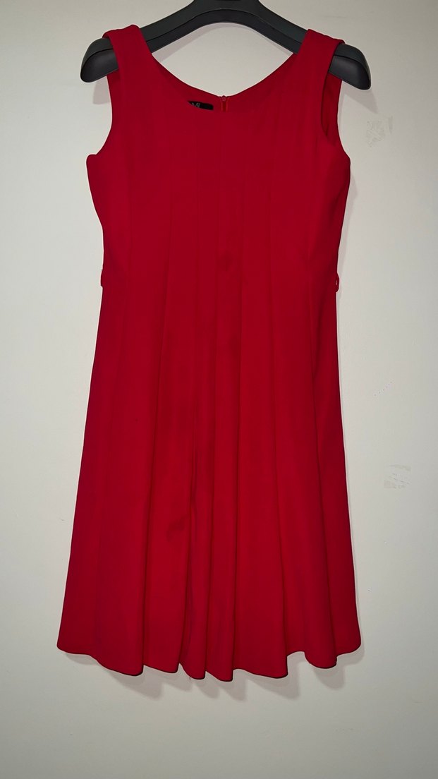 Kırmızı, kolsuz, V yakalı ve pilili detaylara sahip, vücuda oturan midi elbise. Ofis için modern klasik tarzda. Kameradan dolayı lekeli çıkmış lekesi vs yok.
