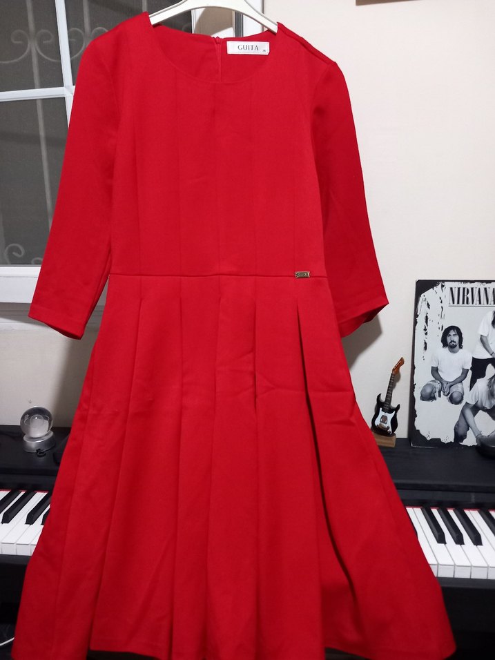 Kırmızı pilili midi elbise, uzun kollu ve bisiklet yaka detaylıdır. Parlak kumaşı ve klasik kesimi ile ofis için uygundur. ✨