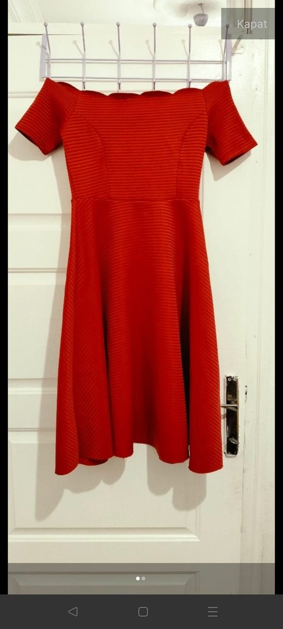 Kırmızı, pilili ve diz boyu, dar kesim elbise. Kayık yaka ve kolsuz, parlak sentetik kumaştan. Modern klasik tarzda, romantik akşamlar için uygun. ❤️