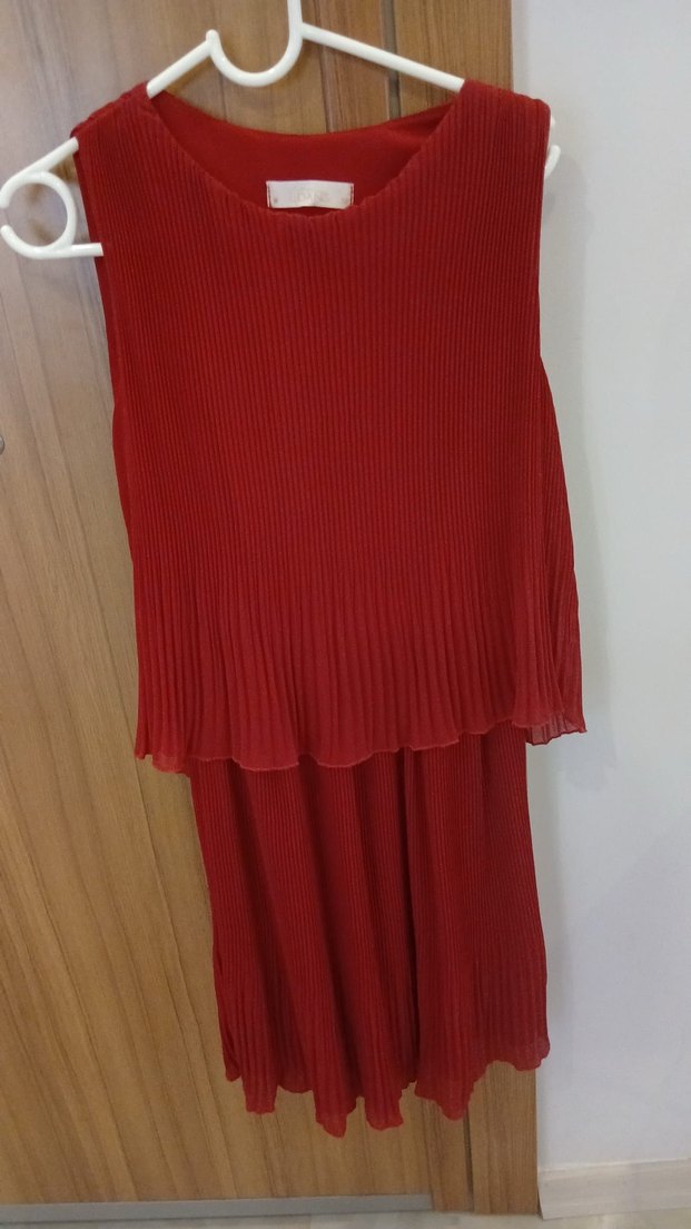 Kırmızı renkli, pilili tasarıma sahip, kolsuz midi etekli takım . Yuvarlak yakalı ve rahat bir kesime sahiptir. Hiçbir defosu yoktur S bedendir