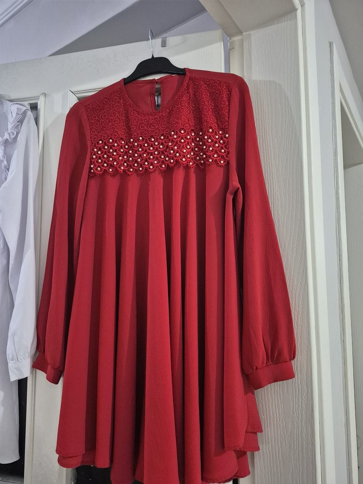 Kırmızı, parlak sentetik kumaştan yapılmış uzun kollu, yüksek yakalı ve pilili detaylı tunik. Nakış süslemeleriyle sade ve şık bir görünüm sunar.