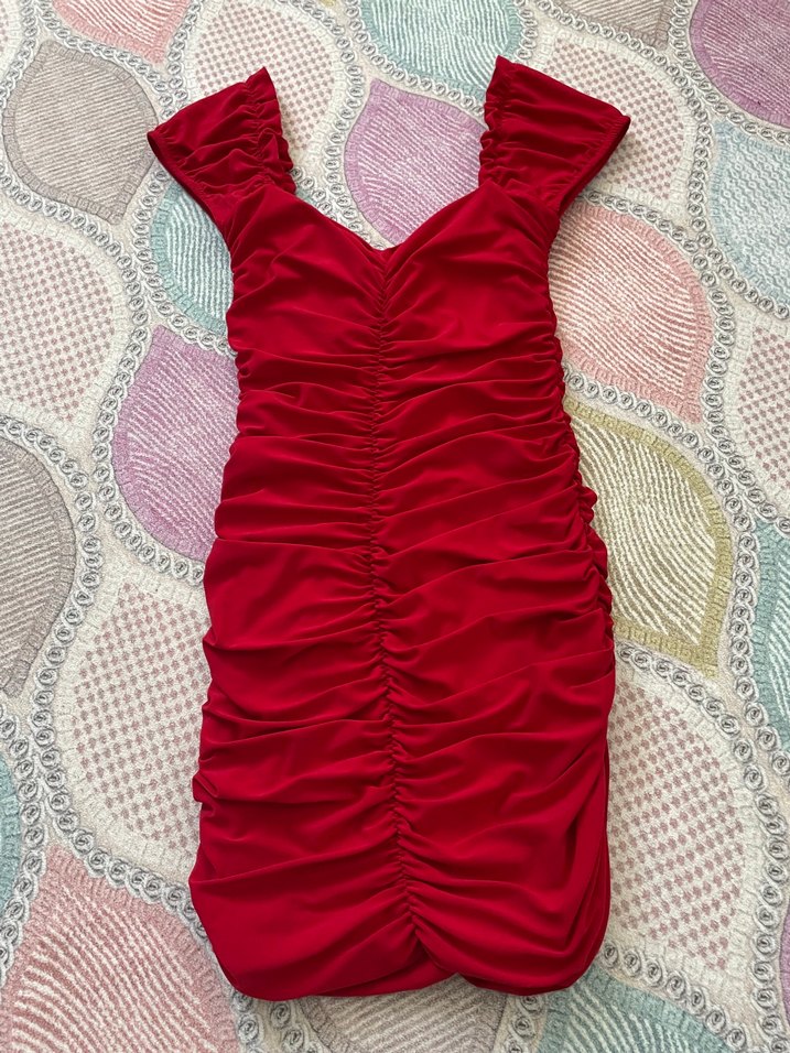Kırmızı, kolsuz, V yaka ve pilili detaylara sahip, vücuda oturan midi elbise, gösterişli parti stilleri için uygundur. ✨