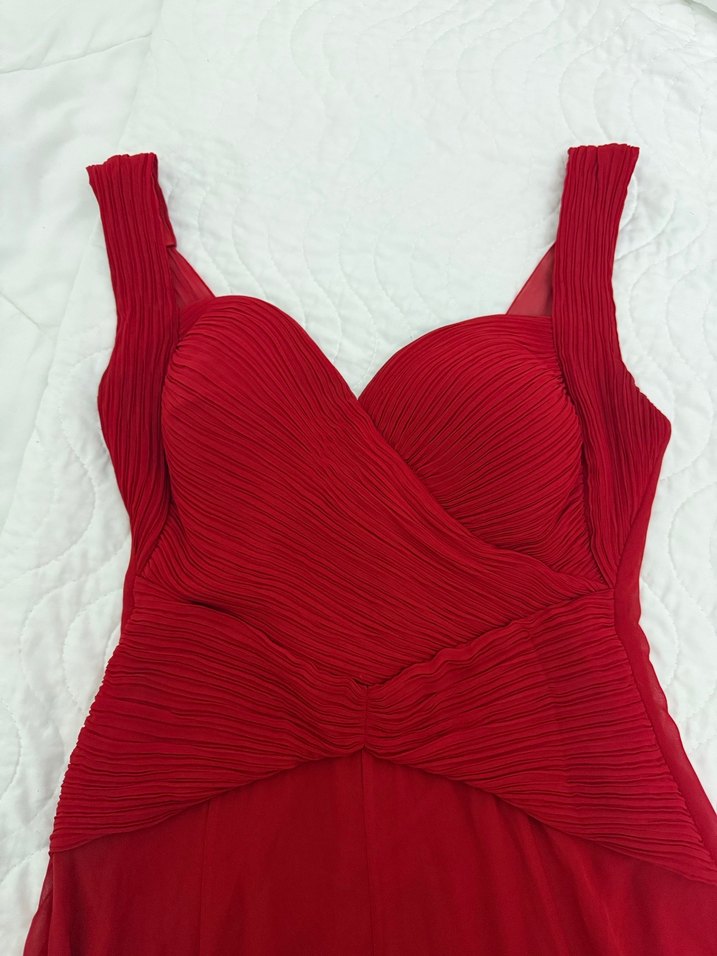 Kolsuz, v yaka ve pilili tasarıma sahip kırmızı renkli, dar kesim uzun abiye elbise. Modern klasik tarzı ve gösterişli görünümüyle düğünler için uygun.