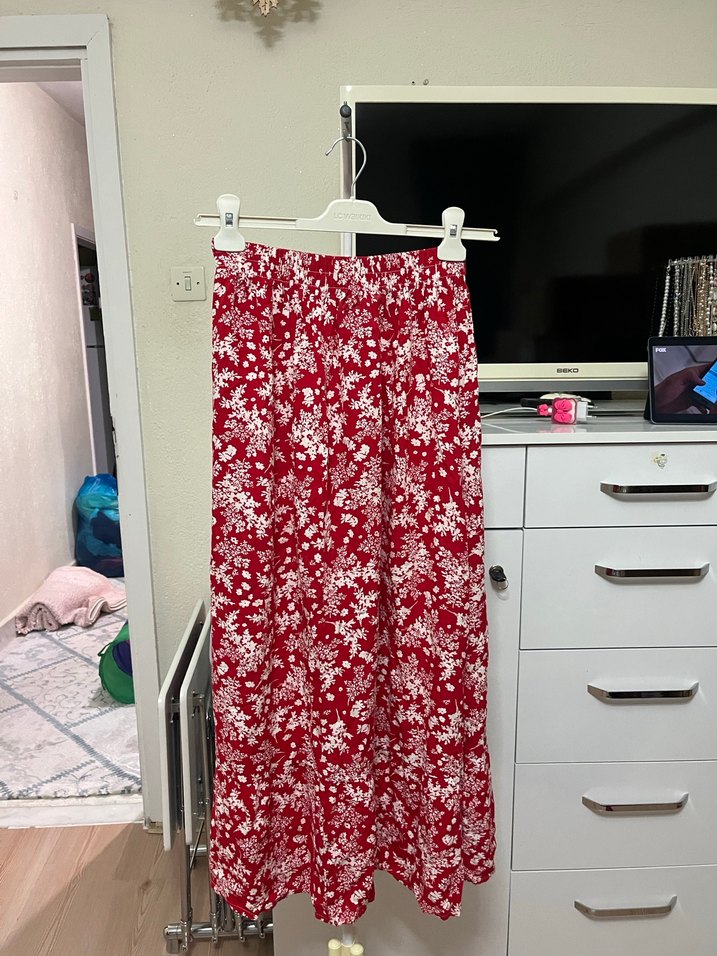 Koyu kırmızı bağlama desenli, pamuk kumaştan, piliseli ve bol kesim uzun eteği. Bohem tarzına uygun, günlük kullanıma ideal.