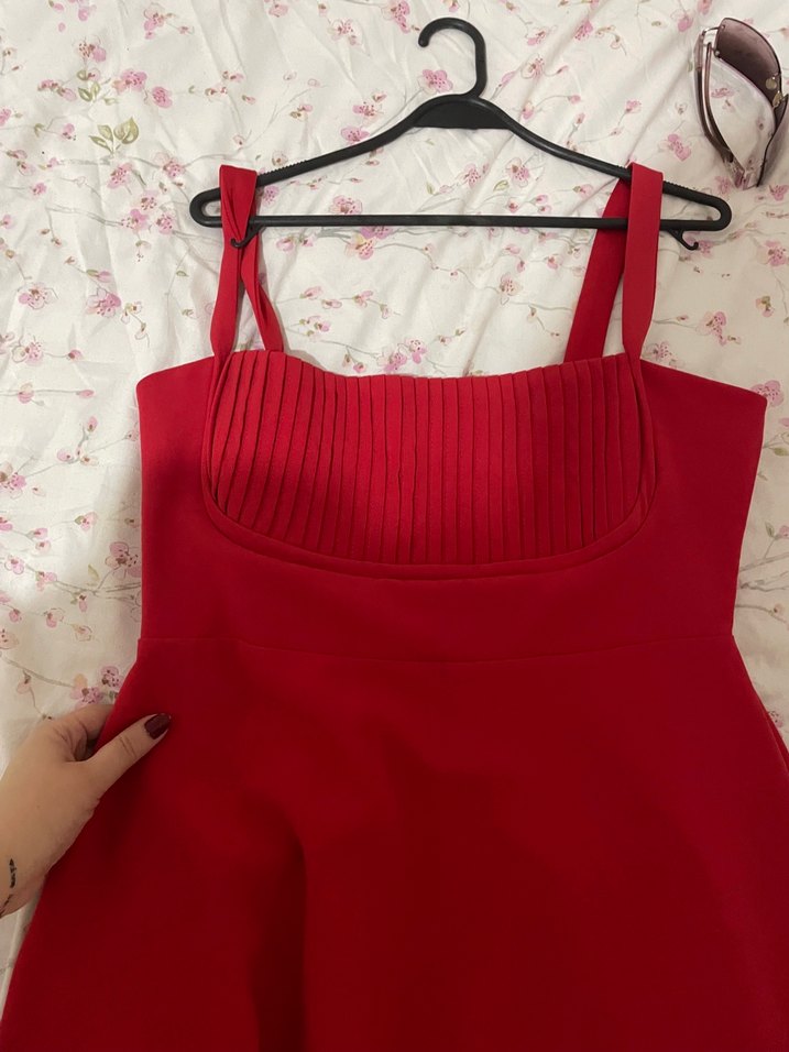 Kırmızı, piliseli detaylı, straplez ve dar kesim midi abiye elbisedir. Parlak kumaştan olup modern klasik tarzda, romantik akşamlar için uygundur. 1 kez arkadaşımın düğününde giydim hiçbir hasarı yok, elimden çıksın diye uygun koyuyorum