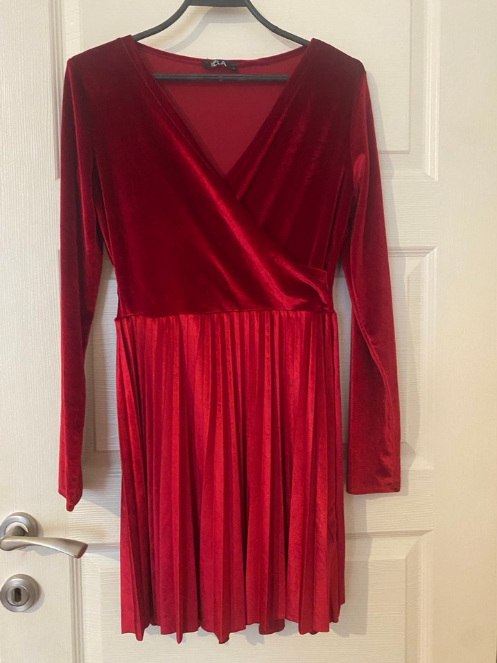 Kırmızı, V yaka ve uzun kollu bu fitted kadın gece elbisesi piliseli etek kısmıyla dikkat çeker. Midi boyda, cesur ve şık bir görünüm sunar. ❤️