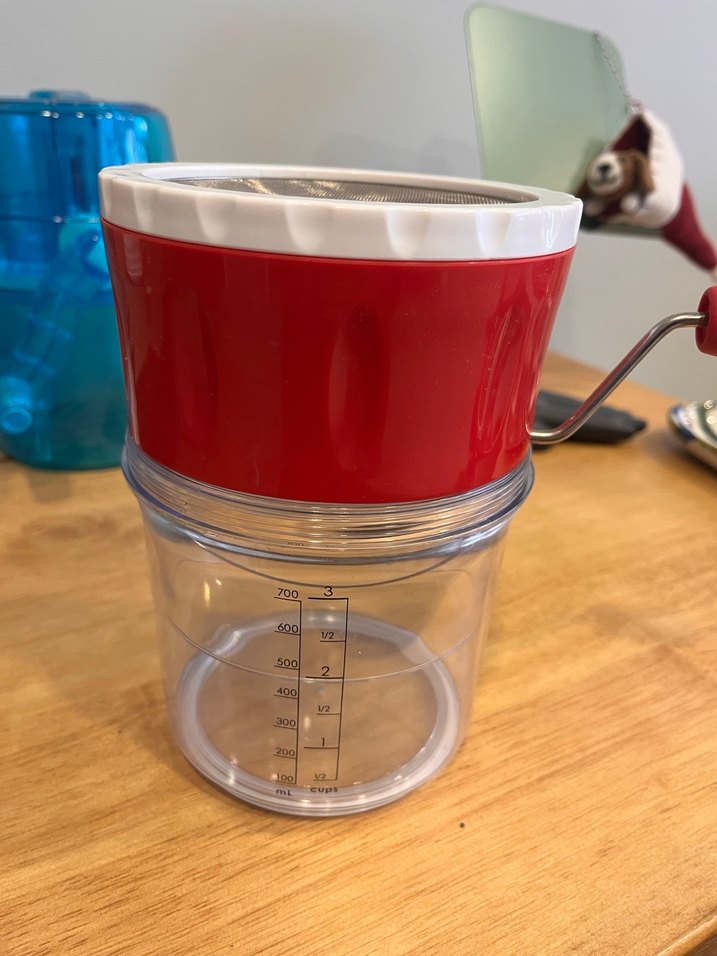 Kırmızı plastik malzemeden üretilmiş, üzerinde ölçü işaretleri bulunan kap ve ince elek kısmı olan un eleme