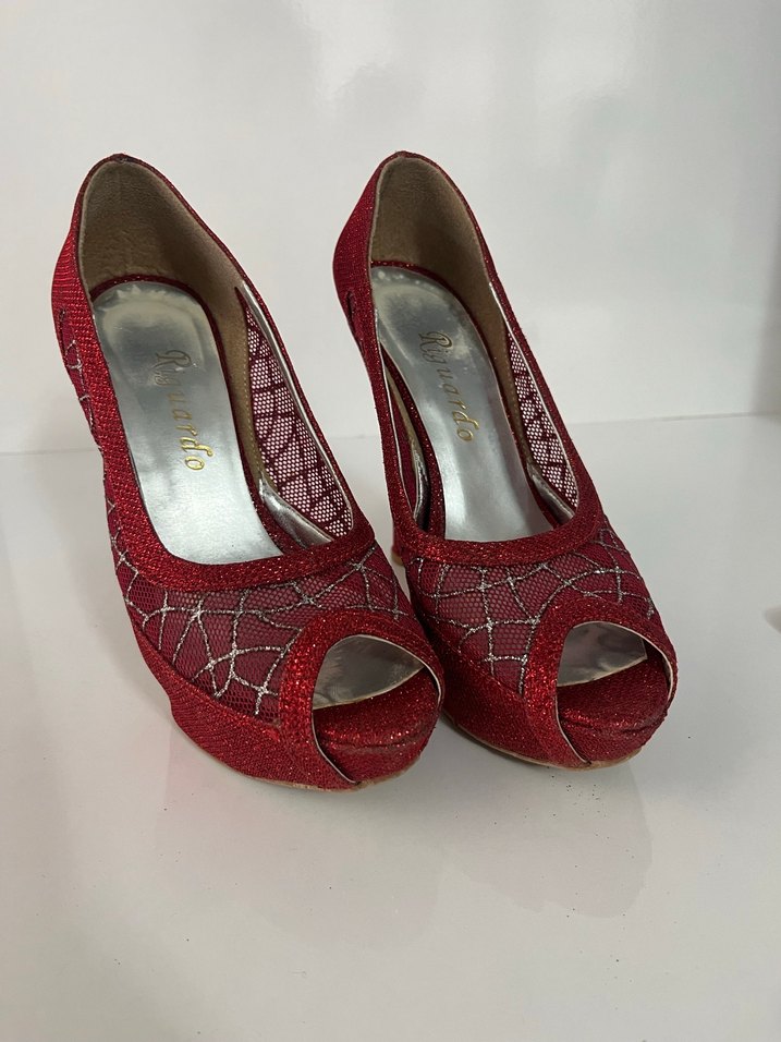 Kırmızı platform topuklu ayakkabılar, dantel ve renkli yılan desenine sahip, kauçuk malzemeden üretilmiştir. Düğünler için klasik ve göz alıcı bir stil sunar.