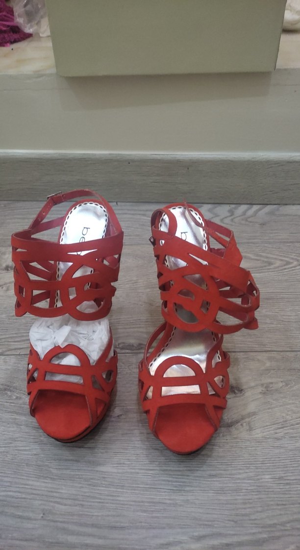 Kırmızı platform topuklu, kesimli detaylı ve tokalı kadın akşam ayakkabısı. Romantik akşamlar için uygundur. Kauçuk malzemeden, baskılı desenlidir.