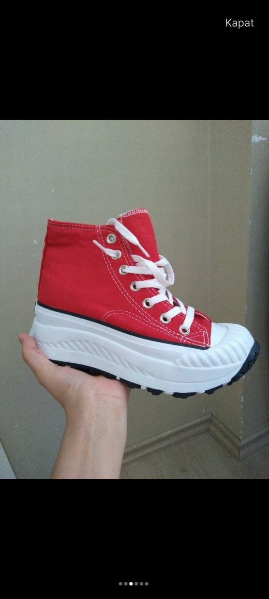 Kırmızı platform topuklu spor ayakkabı, elastik detaylarla rahat ve dayanıklı kauçuk tabanlıdır. Spor ve sokak stili için uygundur.