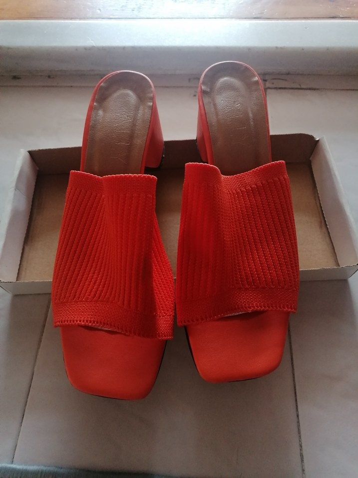 Kırmızı renkli, blok topuklu ve pliseli detaylı kadın terlikleri. Kauçuk malzemeden yapılmış, parlak yüzeye sahip, modern ve minimalist tarzda, romantik akşamlar için uygun.