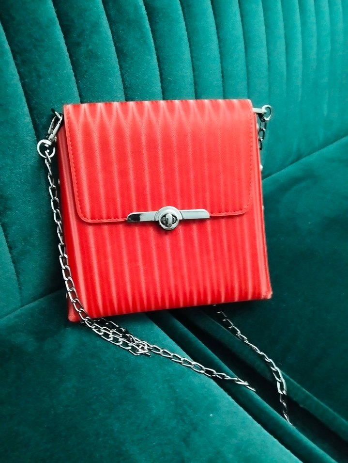Cesur kırmızı kadın çanta, pliseli deri ve zincir askıya sahip çağdaş tasarım sunar. Paris tarzından ilham alan renkli, desensiz görünüme sahiptir. Günlük kullanım için uygundur.