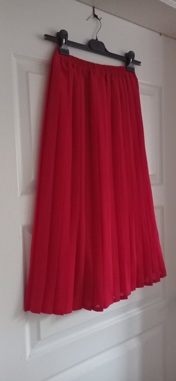 Kırmızı renkte, pliseli ve bol kesim midi boy etek. Şifon kumaş, ipeksi dokusuyla günlük kullanım için uygundur.