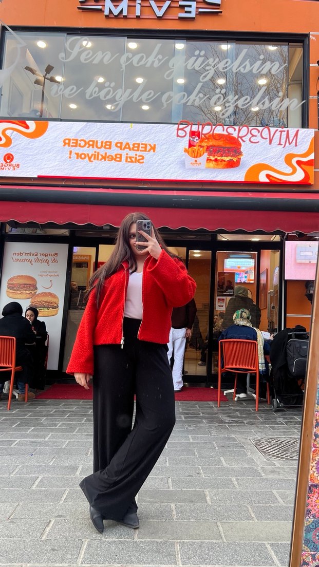 Kırmızı, pofuduk ve parlak yüzeyli, uzun kollu, yüksek yakalı, midi uzunlukta bol kesim ceket. Günlük rahat kullanıma uygun.